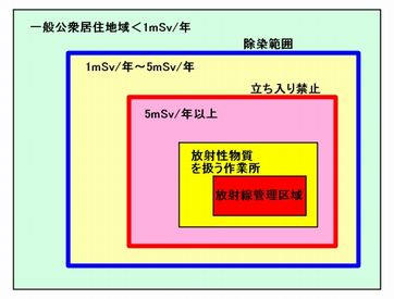 人工放射線による追加放射線量で5mSv/年、あるいは放射能レベル40kBq/m2を越える地域については、国内法との整合性から、暫定的な放射線管理区域を設定して、一般公衆を立ち入り禁止にしたうえで『可能な範囲』で除染を行うことにすべきである。