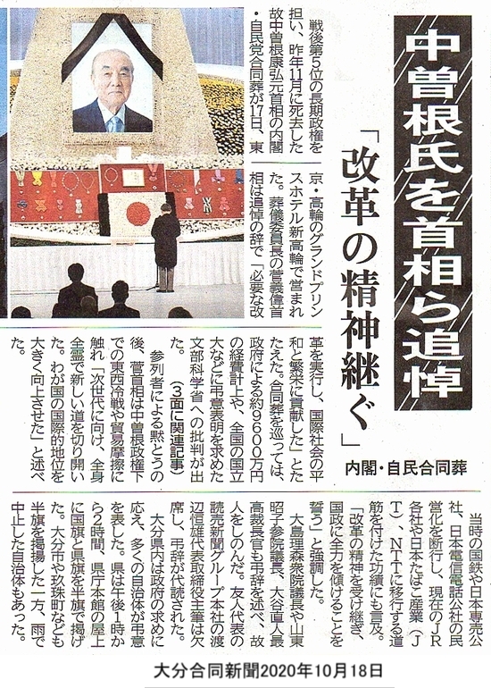 今日、大学の恩師の所に行って話をしたのですが、学術会議の任命拒否もさることながら、私人である中曽根康弘の自民党と内閣の合同葬という馬鹿げたセレモニーに対して、文科省が全国の国立大学などに対して弔意を示すように通達した件について、これは踏み絵だという話をしてきました。現職の総理が殉職したならいざ知らず、議員を辞めて単なる私人の合同葬儀に国家が税金で費用を支払い、あまつさえ文科省という国家機関が大学などに対して通達を出すなど、あきれ果てた国家権力の濫用です。 だんだん戦前のような独裁体制になってきた、嫌な時代になってきたね、と話しました。だんだん軍靴の音が高くなるように感じるこの頃です。