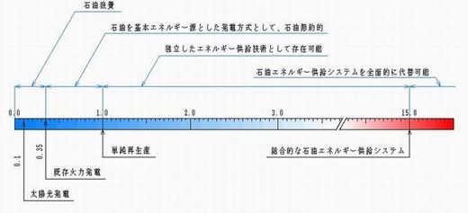 まず一つは、石油代替エネルギーシステムによって、現在の石油によるエネルギー供給システムを全面的に置き換えるという場合である。その最低の必要条件は、既に述べたように、単独のエネルギー産出比が大きく1.0を上回ることである。仮に現時点における石油によるエネルギー供給システムのエネルギー産出比が15だと仮定すれば、同程度、少なくともエネルギー産出比が10程度でなければ現実的ではない。