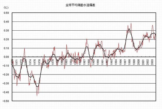 海面水温偏差とは、1971年から2000年の各領域の月毎の平均水温と各月の平均水温の観測値との差を示す。 各月に対してこの水温偏差の全球(有効な観測値の存在する領域について)の平均値を求めたのが全球平均海面水温偏差である。これを下図に示す。
